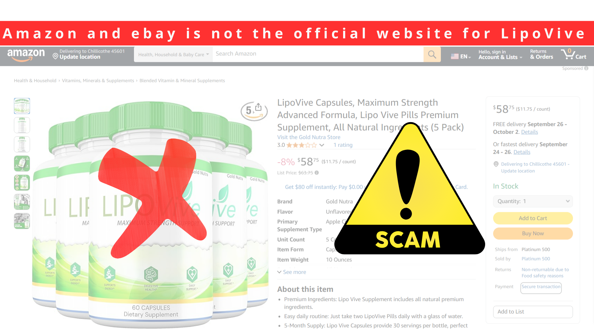 We strongly advise against purchasing Lipovive from Amazon, Walmart, eBay, or unauthorized retailers, as these versions may contain incorrect or unsafe ingredients, putting your health at serious risk.